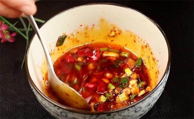 8.锅里烧热油,把热油浇到碗里面,激发出食材的香味,用勺子给它搅拌均匀,接着往里面加入一勺生抽,再加入两勺香醋,然后把料汁完全的搅拌均匀。