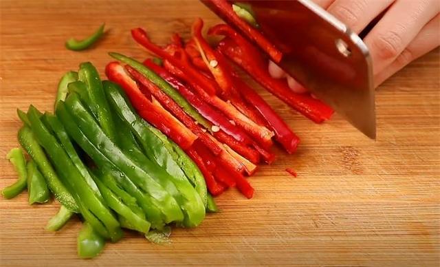 3.准备半个青椒,把青椒切成丝,再准备半个红椒,把红椒也切成细丝。