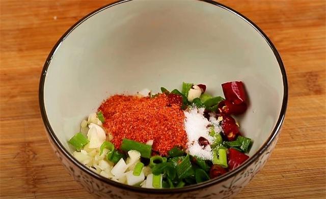 4.再准备几个大蒜,把大蒜切成蒜末,准备2根小葱,切成葱花,再准备几个干辣椒切成小段,把切好的食材放入到一个碗中,加入一勺辣椒面,再加入适量的食盐。