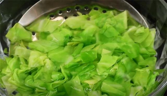 5.锅里水开之后把包菜放进去,把包菜煮熟,煮熟之后捞出,然后过一下凉水,过一下凉水之后包菜吃起来口感会更加爽脆。