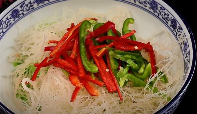 7.把包菜控干水分后放入盆中,再把龙须菜放进去,加入切好的青红椒。