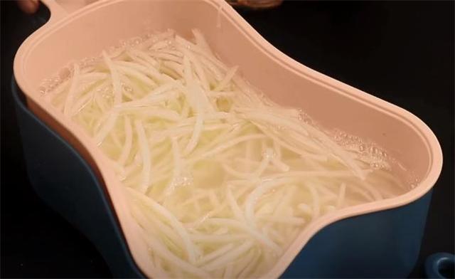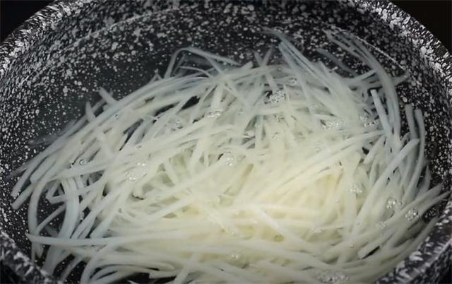 2.锅里水开之后下入土豆丝焯水,土豆丝焯至断生之后,然后再过一下凉水。