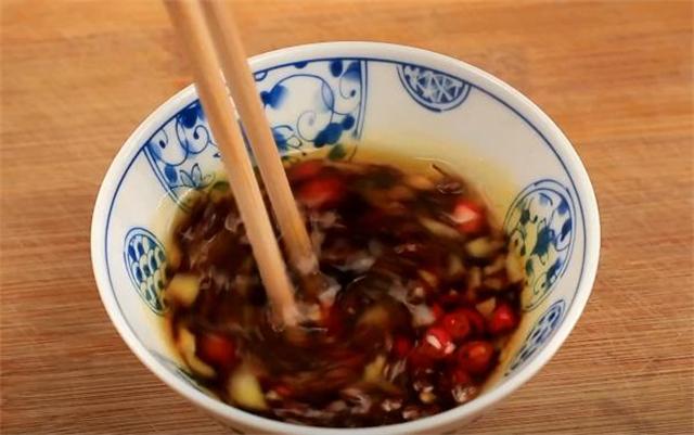 6.起锅烧油,油温烧高后下入花椒,炸成花椒油后淋入碗中,加入食盐和白糖,加点生抽,再加点陈醋,用筷子拌匀。