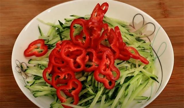 3.准备一根红椒给它切成红椒圈,切好后和黄瓜丝放在一起。