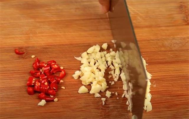 4.准备两根小米辣切圈,再剁一点蒜末。
