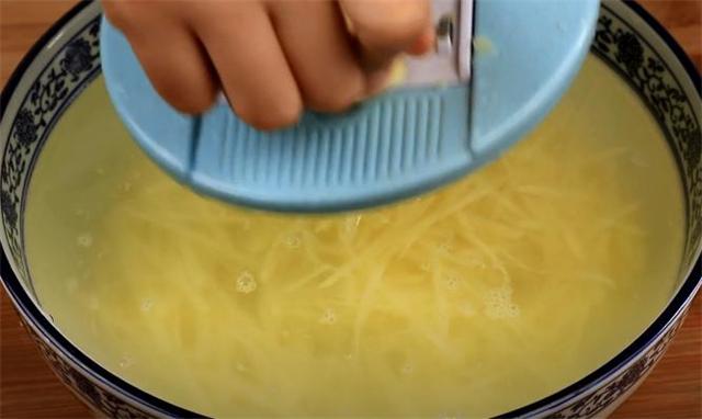 1.土豆去皮之后擦成土豆丝泡在水里面,泡在水里的目的是为了防止土豆丝氧化变黑。