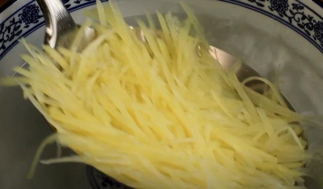 5.锅里水开后加2g食用油,土豆丝下锅焯水30秒左右,土豆丝不能焯水时间过长,过长就不爽脆了,焯水后立刻放入凉水中。