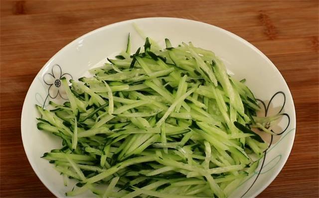 2.然后再把一根黄瓜也擦成黄瓜丝,擦好之后放在盘子里备用。