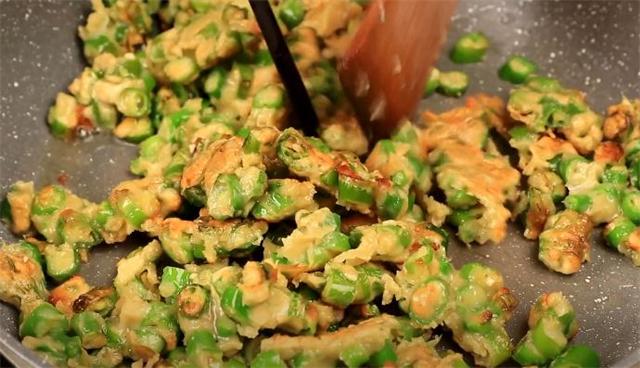 4.一面煎至差不多的时候我们给它翻个面继续煎,两面都煎得差不多的时候用筷子打散,打散之后再稍微翻炒一下就可以出锅了。