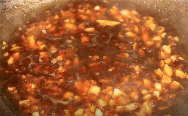 5.起锅烧油,下入蒜末,把蒜末炒香,炒香之后加入生抽,素蚝油,再淋入一点水淀粉,慢慢的熬,熬至汤汁浓稠的时候关火。