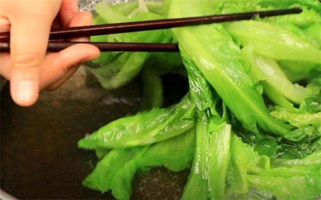 3.准备半锅的水,我们把它烧开,烧开之后加一点点食盐,再加一点食用油,把生菜下入锅里焯水,稍微烫一下就可以了,把生菜烫至变色捞出,大概20秒左右的时间就可以。