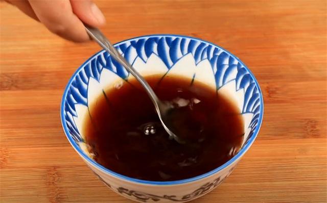 3.下面我们来调个料汁,碗里加点香醋和生抽,再加点素蚝油和白糖,加入适量的清水,用勺子搅拌均匀备用。