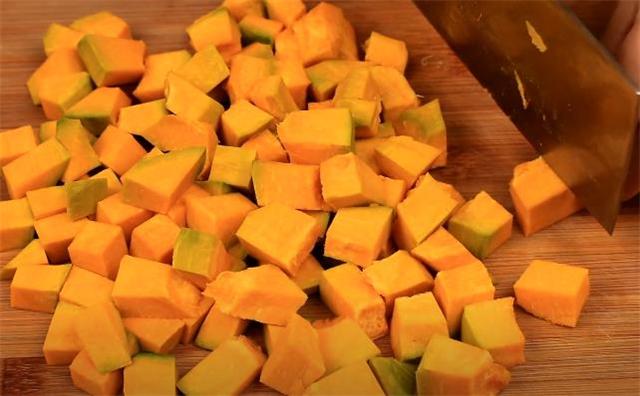 1.我们先把南瓜皮削掉,再把里面的南瓜瓤去掉,再把南瓜切成小方块,切成这样比较小的南瓜丁就可以了,切好之后装入盘中备用。