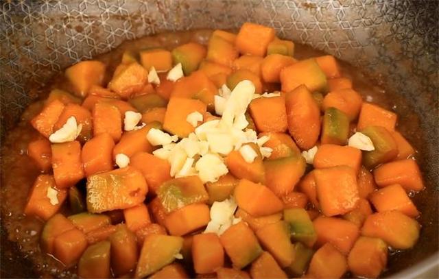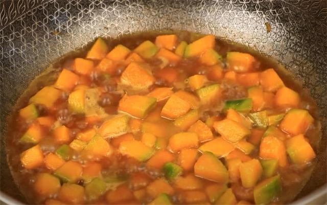 4.起锅烧油,油热下入南瓜,炒至南瓜棱角有点模糊的时候加入一点食盐,倒入刚刚调好的料汁,盖上盖子焖至汤汁浓稠,改用小火。