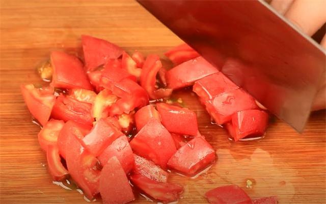 3.准备一个洗净的西红柿,我们把它切成小块。