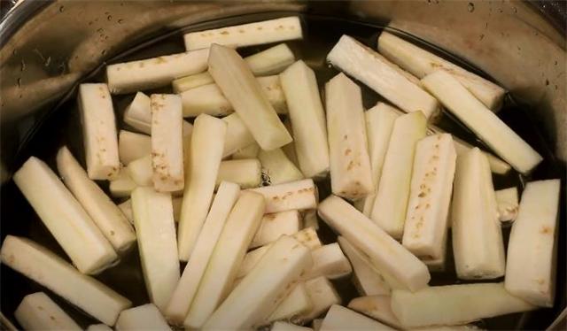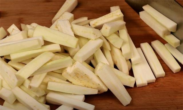 1.茄子去蒂之后我们把皮给它削掉,然后把茄子切成约5厘米长的小段,最后改刀把茄子切成这样的细长条。
