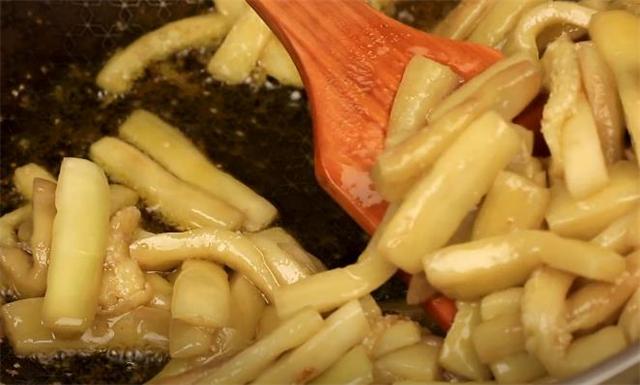 6.起锅烧油,食用油我们要多加一点,油温五成热下入茄子,开大火把茄子里面的水分炒出来,我们看一下,茄子已经炒得很软了,里面的水分已经炒出来了,下面我们把它铲出备用。