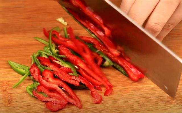 2.准备半个青椒和半个红椒,把它也切一下,作为配菜搭配起来颜色比较好看。