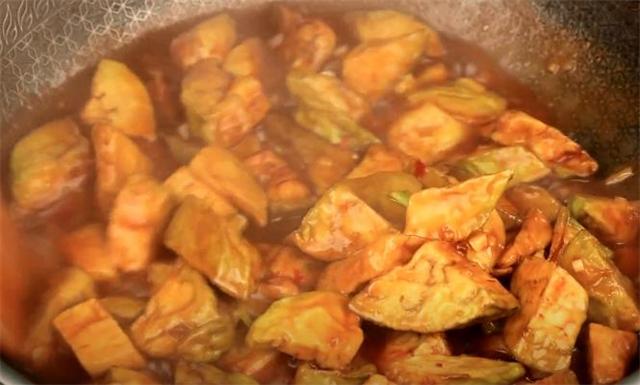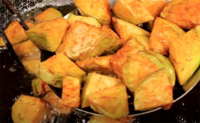 4.锅里油温六成热下锅炸茄子,炸到金黄酥脆后出锅。