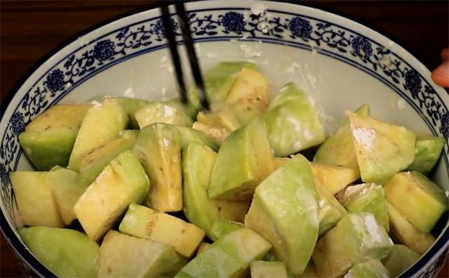 2.接着分次加入淀粉,把茄子都裹上一层淀粉,这样茄子吸油会特别的少。