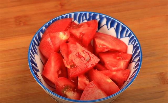 2.把西红柿的硬蒂切掉,再切成小块,也装入到碗中备用。