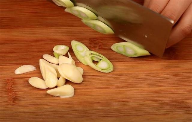 3.准备几个大蒜切成薄片,再切一点大葱。