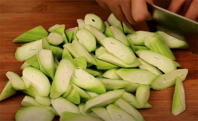 1.先把丝瓜的皮削掉,去皮之后切成滚刀块,切好之后装入盆中。