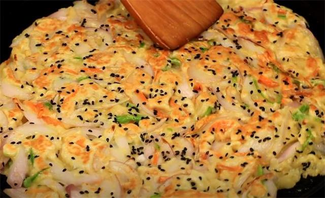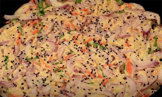 准备食材: 洋葱、胡萝卜、青椒、盐、胡椒粉、普通面粉、清水、食用油、黑芝麻 具体做法: