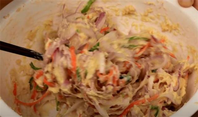 5.把青椒和胡萝卜丝放入洋葱里面,加点食盐,再加一点胡椒粉,给它搅拌均匀,往里面加入适量的面粉,再加入适量的清水,面粉可以分次少量的加入,用筷子搅拌成这样粘稠的糊状就可以了。