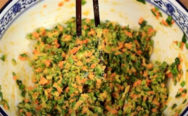 3.把韭菜也切成碎末,韭菜和胡萝卜放在一起,加两勺食用油,少加点食盐和白胡椒粉,用筷子搅拌均匀,搅匀后再加入适量的清水,玉米面边加边搅拌,再少加点面粉,搅拌成这个样子就可以了。