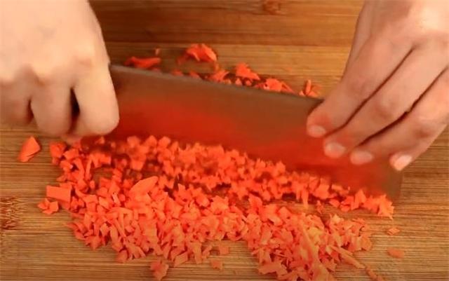 2.一个洗净的胡萝卜切成细丝,然后再剁成胡萝卜末。