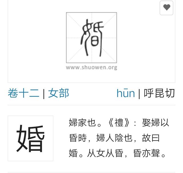 最近很多人都比较的关注我们汉字文化,很多人不太理解这个“婚”字,要说有个女字了,也应该有男字在里面啊,但是其实并没有了,那么这个造字有什么故事呢?“婚”字有什么说法呢?下面我们一起分析看看吧! 01.婚是什么 “婚”是什么?这大概要从不同的婚姻制度说起。时代不同婚姻的含义不同。在古代一夫一妻多姬妾制度之前,出现过“血婚”、“伙婚”“抢婚”等。 ![]() 所谓“血婚”就是指同姓宗族为婚,参见伏羲女娲可知血婚的含义即:姻亲不避血亲。 所谓“伙婚”则是指同一个部落的所有男子以另外一个部落的女子为妻。也就是说:“我的父亲的兄弟皆为我父亲,我的母亲的姊妹皆为我母亲。”历史上有名的娥皇女英共侍一夫的典故其实是“伙婚”的典例。事实是娥皇女英嫁与了舜、象为妻。 “血婚”出现在蒙昧之初,此时的婚姻只以繁衍生息为目的。“伙婚”则出现在母系氏族社会时期,是母权高于父权的象征,此时的婚姻更是社会权利分布的折射。随着生产力的提升,男人的天然优势扩大,社会开始朝着父系氏族社会发展。 “抢婚”则出现在母系氏族与父系氏族两种社会体系角逐时期。“抢婚”成为削弱母权的硬性手段。 说到“抢婚”就要从“娶”字说起。《说文解字》中写道:“娶,取妇也。”也就是说古人认为“娶”同“取”。 ![]() “取”又做何解释呢?《说文解字》中解释: “取,捕取也。周礼:获者取其耳。” 也就是说在古代战争中要割取对方的耳朵来标示自己的胜利,“取”的引申意就为:“用武力获取。”这就表明了“抢”与“婚”,“武力”与“婚”的关系。 “抢婚”裹挟着争斗之意,女人开始被当做猎物一样争抢,丧失自主性。此时的婚姻标志着女权的覆灭与主导地位的丧失。 发展到奴隶制社会时期,此时的女子出嫁则必须要陪赠多个媵妾,这表示女性地位的进一步降低。 及至后世伦理纲常观念完备,男女成婚被规定了诸多条框,例如同姓不婚、聘礼、嫁妆、采吉、问名、纳吉、请期、亲迎等等,此时的婚常常与礼联系起来,形成了一套独有的、完备的社会礼仪。 因此追究“婚”的本质,恐怕要与社会发展演变挂钩。“婚”既是一种男女之间的存续关系,又是一种社会关系、伦理关系,还是一种社会礼仪,甚至是一种权利、社会更替的外化表现。 02.为何男女结合称为“婚”? 为何男女结合称为“婚”?或者换言之“婚”为何与男人女人有关?为何在古代特定男女结合才可称之为“婚”? 首先解释一下为何一定与男女有关,首先在古代先民时期生产力低下,生存环境恶劣,只有更多的人口才可以支撑氏族壮大发展。所以男女之间繁衍生息成为重中之重,这就决定了这种社会关系只能存续于男女之间,或“血婚”或“伙婚”或“抢婚”或“一夫一妻多姬妾”。 ![]() 汉代郑玄说: 婚姻之道,谓嫁娶之礼。 唐代孔颖达疏谓: 男以昏时迎女,女因男而来,……论其男女之身谓之嫁娶,指其好合之际,谓之婚姻,……故云婚姻之道,谓嫁娶之礼也。 这就是说在过去婚礼以昏为期,男方必须於黄昏时前往女方家迎娶,女方嫁入男方家。 此处出现了一个时间点即黄昏之前。在古代婚礼常常在傍晚举行。为什么呢? 《说文解字》中解释“婚”字: 婦家也。《禮》:娶婦以昏時,婦人陰也,故曰婚。从女从昏,昏亦聲。 ![]() 《说文解字》中这样解释“昏”: 日冥也。从日氐省。氐者,下也。一日民聲。 ![]() 也就是说“婚”原来是写作“昏”的,原因是在昏时迎娶,昏时日落则又隐含“阳去阴来”之意,女性属阴,所以加上“女”旁为“婚”。既然“昏”有两层意义,而婚礼又与女人有关、与迎“阴”有关,所以索性发展为专门描述男女社会关系的“婚”字。这样表意就十分精准,而不会引人疑惑了。 |