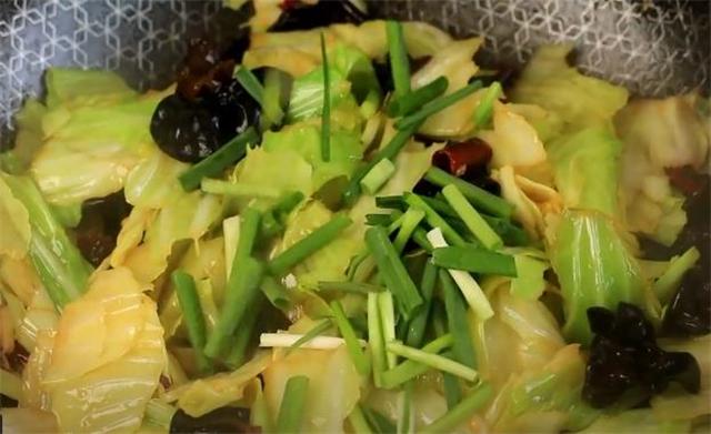 4.起锅烧油下入蒜末和干辣椒段爆香,下入包菜煸炒,炒软后加一勺陈醋,继续翻炒下加入木耳,加适量食盐,再加点白糖提鲜,再加点味精和生抽,炒熟后加入葱段,稍微翻炒下出锅装盘。