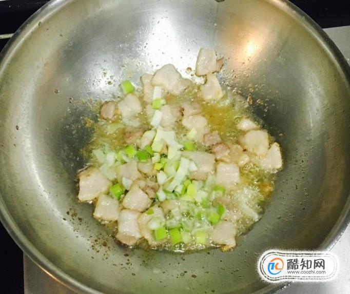 热锅加入适量的花生油把五花肉炒出香味,放入葱花爆香,料酒、生抽烹锅