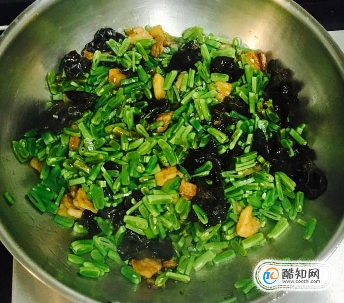 倒入木耳和切好的豆角翻炒均匀,加入适量的清水煮沸后加盐调味儿
