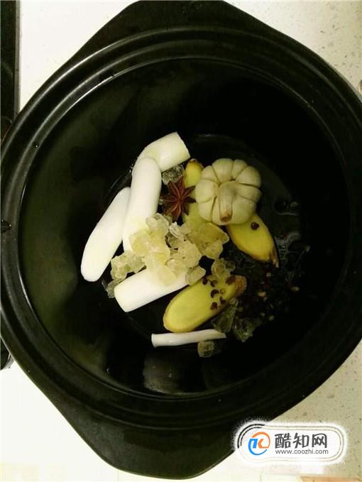 然后准备一个砂锅,将葱姜蒜放入砂锅内垫底,然后倒入适量的清水,再放入主角乌鸡。