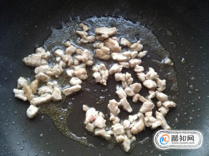 锅烧热,加入少许油,油热后将肉丁放入锅中炒至变色