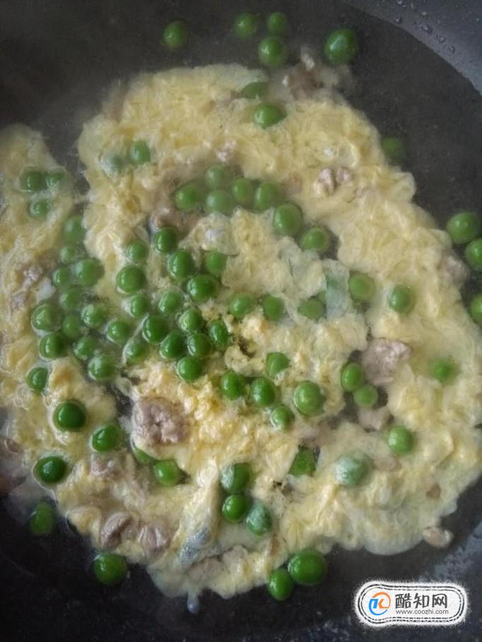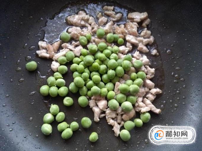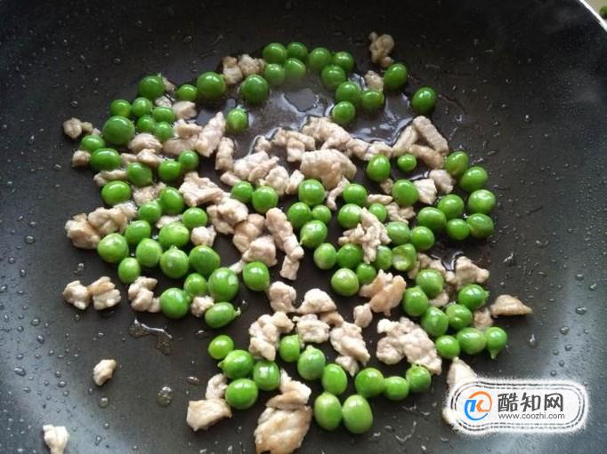 将豌豆倒入锅中,转小火翻炒,炒至豌豆颜色变翠绿豌豆过油炒可以去掉豆腥味