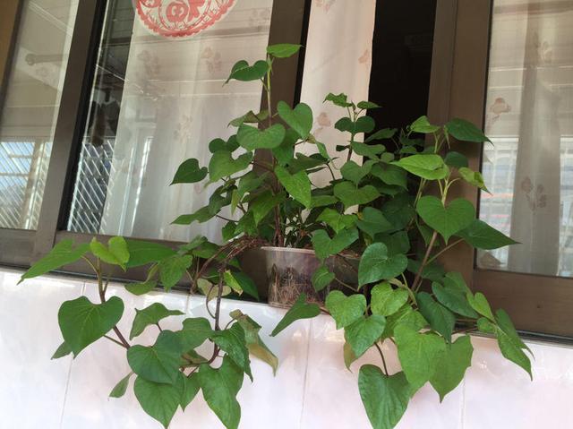 因为成长中的红薯需要阳光,所以我们一般会把红薯根放在窗台让它长。这时我们可以因地制宜,找一条长一点的绳子,绕过窗台,把整个窗台围起来。再把长成的红薯藤慢慢地牵引到绳子上来。