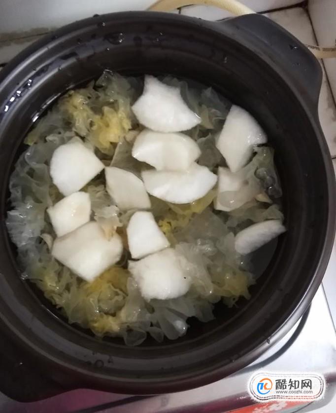 雪梨削皮,切块。百合洗净。将银耳、冰糖、雪梨块、洗净的百合一起放入锅中。大火烧开。