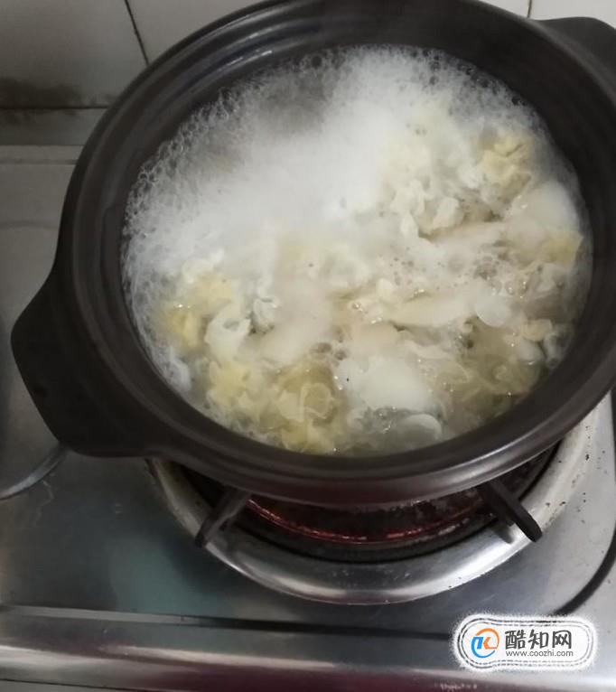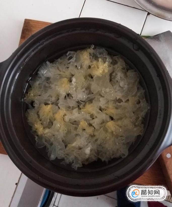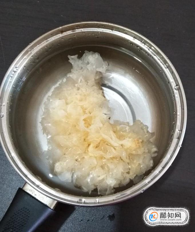 用冷水将银耳泡发,大概10分钟左右。将泡发的银耳撕成小朵,洗净。