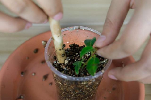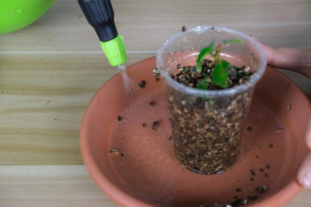 或者可以使用蛭石固定法扦插。将一次性杯子里装满蛭石,杯底挖几个孔,将杯子放在水槽里,让蛭石吸满水。将枝条插入蛭石中并压实,然后保证充足的光照。没水的时候记得给它加水,这样扦插的月季很快就能长出根来。等月季长出根部就能移栽了。