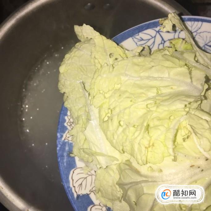往锅中倒入白菜叶子和几片生姜片,开大火煮三分钟。