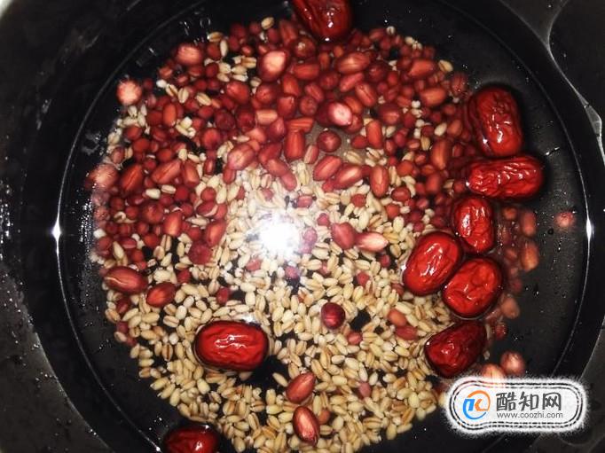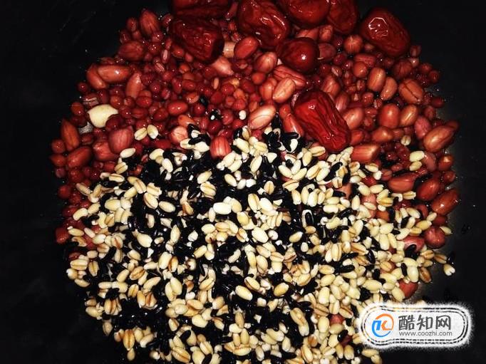 把泡洗过的红豆、花生、糯薏米、黑米、红枣、土红糖准备好。