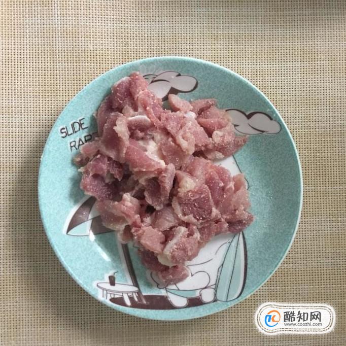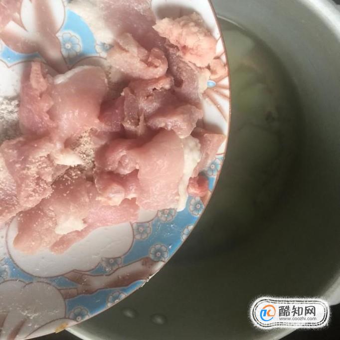 接着把瘦肉洗净,切成薄片并用适量的地瓜粉裹一下。
