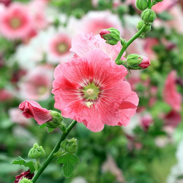 蜀葵 蜀葵是一种常见的地被开花植物,它的花朵呈现出深红色、淡红色、白色等多种颜色。蜀葵的花期较长,从春天一直到秋天都有开花的可能,因此被广泛用于园林绿化中。