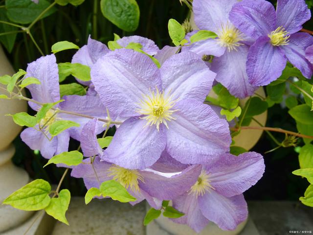 铁线莲 铁线莲是一种多年生的地被植物,它的花朵呈现出深蓝色、紫色、白色等多种颜色。铁线莲的花期较长,从春天一直到夏天都有开花的可能,因此也被广泛用于园林绿化中。