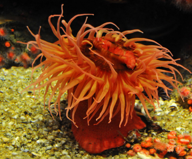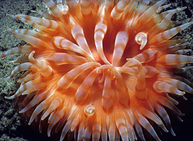 海葵的生存方式: 很少有动物会捕食海葵,它的天敌有浅红副鳚、海星、部分裸鳃类。海葵圆柱状的身躯靠底部强有力的吸盘牢牢地吸在海底的岩石、淤泥上,甚至吸附在贝与蟹的外壳上,即使海浪冲击,也不会把它们冲掉。