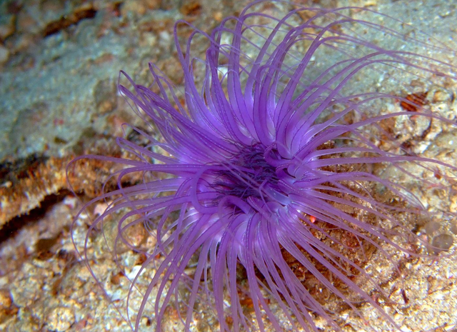 海葵的介绍: 它是一种长在水里的食肉动物,属于刺胞动物,六放珊瑚亚纲的一目,是一种构造非常简单的动物,没有中枢信息处理机构,也就是说它连最低级的大脑基础也不具备。 海葵的单体呈圆柱状,柱体开口端为口盘、封闭端为基盘。口盘中央为口,口部周围有充分伸展的软而美丽的花瓣状触手,犹如生机勃勃向日葵,因而得名。