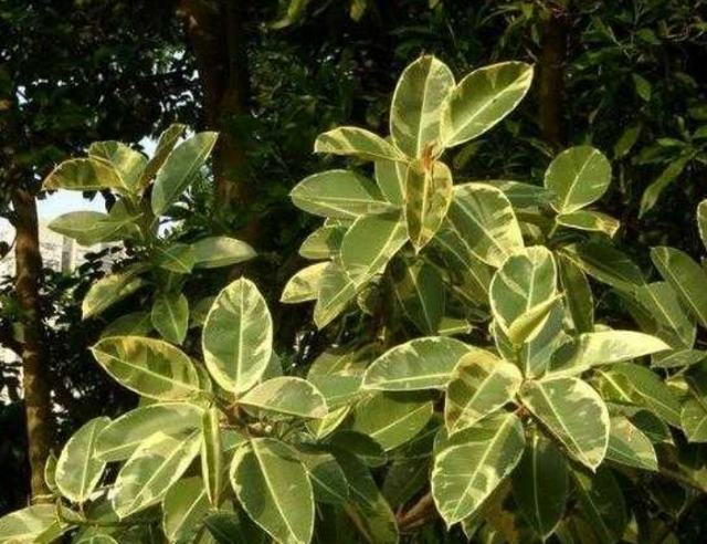 花叶橡皮树 花叶橡皮树是常绿大乔木,树皮光滑,叶椭圆形,长10-30厘米。叶片宽大而有光泽,具有美丽的色斑,树形丰茂而端庄。小型盆株可作窗台、书桌布置。大型盆株可作厅堂、办公室和会议室布置。
